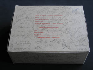 On our first evening in Lille, as the empty box lunch boxes were being unloaded from the bus to the hotel, I gazed upon them wistfully, hoping, perhaps, one day to be invited to partake in this ritual of military life; it is the stuff of romance. Then, on April 6th, the convoy of buses pulled over to the side of the road for the midday break and the coveted box lunches were distributed. From the midst of the 300 or more troops, there came but one squeal of delight. To paraphrase Truman Capote, "I fell upon it like an abused orphan.". The contents were then unsentimentally dumped into my handbag and the box was passed around for the troops to autograph. Of course, the second box lunch was greeted with less enthusiasm. "Not this again. Not another grated-carrot sandwich." Ever notice how quickly fun turns to tragedy? It now holds treasure from the trip and what lovely keepsakes they are.